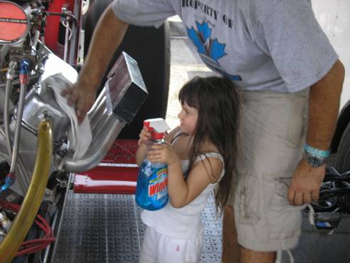 Lizzie helps her dad polish the valve cover.